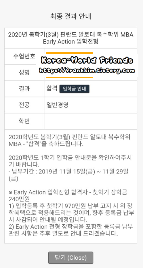 2020년 봄 3월 학기 핀란드 알토대 복수학위 MBA early action 입학전형 합격이다.